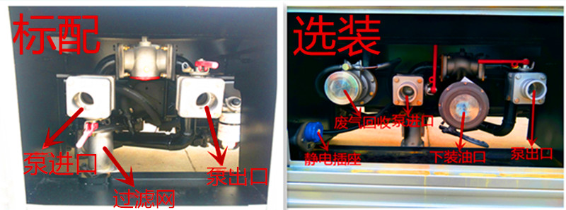 配備電腦稅控加油機,自動回位卷盤,加油槍,帶取力器,專用油泵,兩根等長輸油管,三通球閥扳手一把,兩把小鎖,兩支滅火器,兩個堵蓋,一個防火帽,兩側及后加強型保險杠,折疊式防護欄,后防滑爬梯.